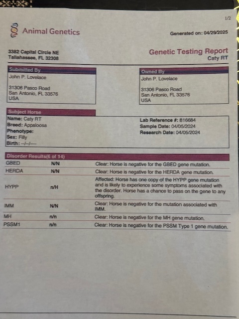 23. Genetic Test Results: The Seller shall notify PHS of the results of any genetic testing and the results will be stated in the catalog. If not shown on AQHA registration papers, proof of genetic test results MUST BE sent to PHS with the entry form. 2.) If a horse has not been genetically tested the seller shall notify PHS of that fact and it will be stated in the catalog.
